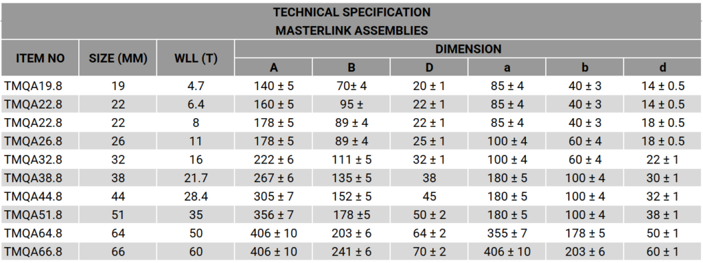 Tuigmeester offers a range of high-quality master links and master link assemblies designed for robust performance in various rigging and lifting tasks. Each product is quenched, tempered, and individually proof tested to ensure maximum safety and reliability.